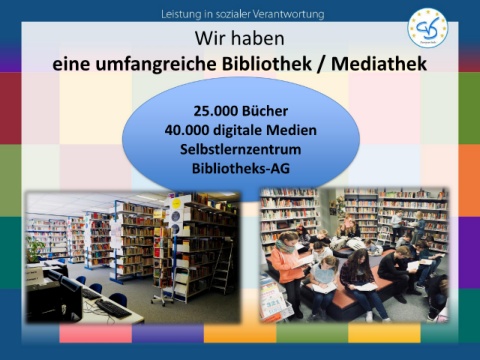 Wir haben eine umfangreiche Bibliothek / Mediathek 25.000 Bücher 40.000 digitale Medien Selbstlernzentrum Bibliotheks-AG