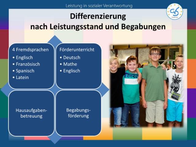 Differenzierung nach Leistungsstand und Begabungen 4 Fremdsprachen Förderunterricht • Englisch • Deutsch • Französisch • Mathe • Spanisch • Englisch • Latein Hausaufgaben- Begabungs- betreuung förderung