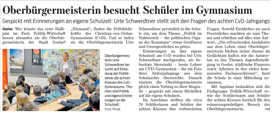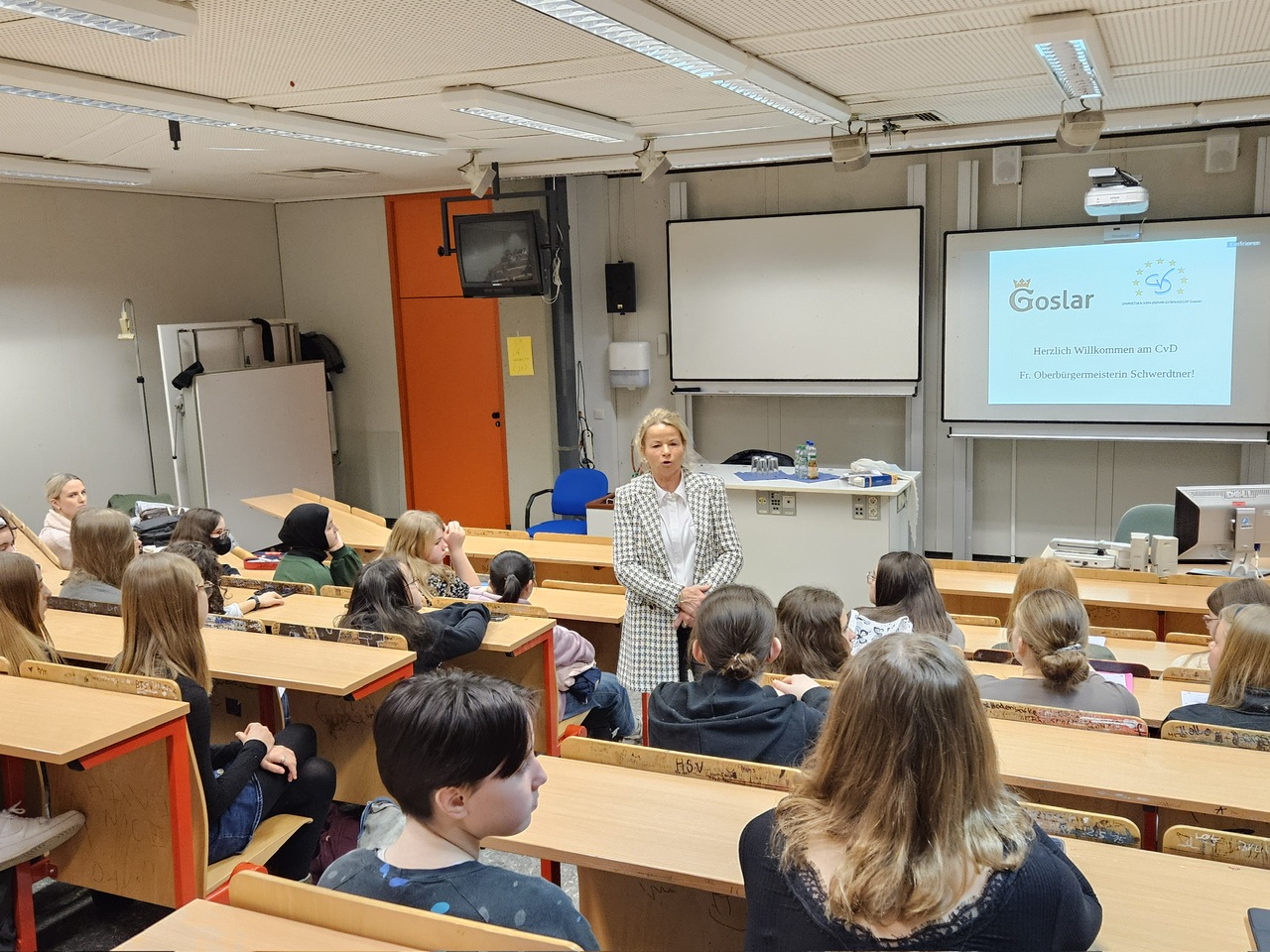 Wer könnte das erste Halbjahr im Fach Politik-Wirtschaft besser abrunden als die Oberbürgermeisterin der Stadt Goslar? Niemand. Und so luden die Politiklehrkräfte des Christian-von-Dohm-Gymnasiums die Oberbürgermeisterin Urte Schwerdtner persönlich in die Schule ein, um dem Thema „Politik im Nahbereich – die politischen Organe der Kommune“ etwas Greifbares und Unvergessliches zu geben.