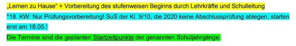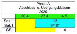 In der Tabelle zur Wiederaufnahme des Unterrichts ist auf Seite 4 der 20.04.2020 als Beginn der Phase A ausgewiesen. Tatsächlich ist der Wochenbeginn der 20.04.2020, aber erst ab dem 22. April (Mittwoch) wird verbindlich zu Hause gelernt. Bis dahin haben die Schulen Zeit für die Vorbereitung der Phase A. Ich bitte diesen Hinweis zu berücksichtigen.